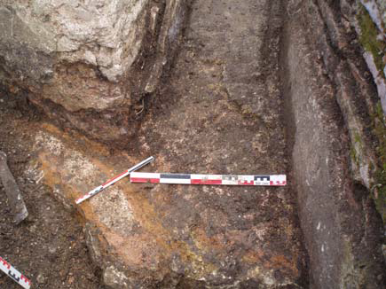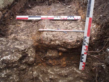 La base du conduit est constituée d’un béton à tuileau reposant sur un hérisson de moellons, le tout remplissant la tranchée creusée dans le substrat rocheux (Cliché 2). À droite, le piédroit, réalisé en moellons est encore en place, alors que le piédroit gauche a été supprimé pour permettre l’agrandissement du conduit à l’arrivée du deuxième aqueduc.