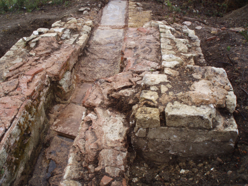À partir du carrefour, le conduit en béton moulé se déploie vers le pont sur 1,70 m, avant de rencontrer le conduit du premier aqueduc. À cet endroit de chaque côté, les piédroits sont réalisés en fragments de tegulae, venant s’appuyer sur le béton moulé qui a été coupé.