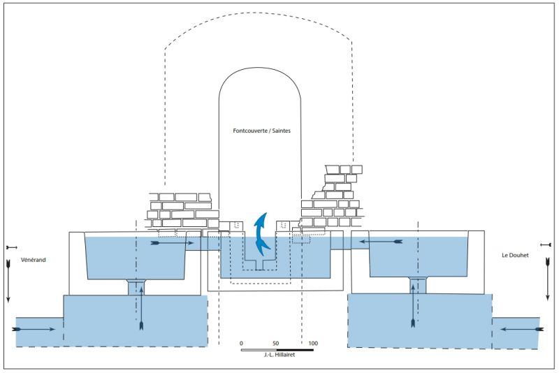 Ce lieu recèle un complexe hydraulique totalement inédit dans l’antiquité, comprenant un bâtiment recevant les deux aqueducs, dans lequel plusieurs bassins monolithes en calcaires sont reliés entre eux pour le passage de l’eau potable, dont certains se superposent. Un système de nettoyage avec tuyaux de plomb et cloaque d’évacuation se trouve dans la partie inférieure qui emmène les eaux vers le centre de la vallée. Perpendiculaire aux aqueducs, une galerie construite hors-sol envoie les eaux de l’aqueduc vers Saintes, avec un specus en blocs monolithes en forme de U. En amont du bâtiment, les deux arrivées possèdent des aménagements spécifiques, tels des déversoirs qui régulent le débit de l’eau.