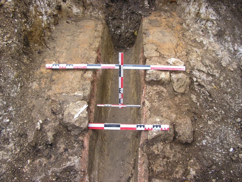 Ensuite, un nouvel enduit de mortier à tuileau a été appliqué sur l’enduit précédent dont les analyses montrent qu’il correspond au troisième aqueduc. Celui-ci a également un profil trapézoïdal avec un fond en plein cintre inversé. À cet endroit, il n’y a plus de dalles de couverture (récupérées).