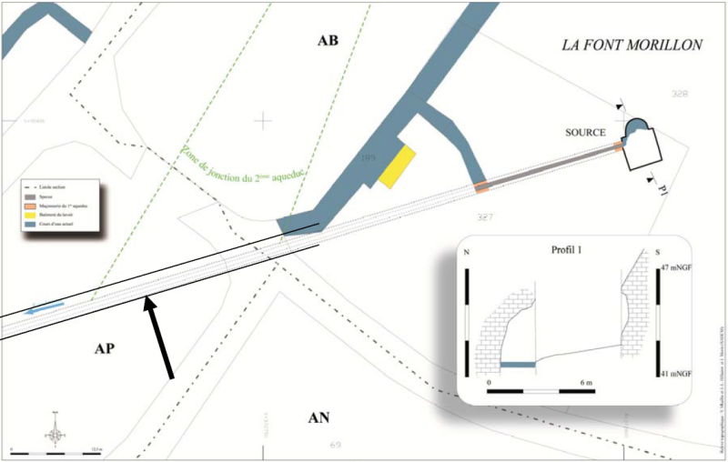 A quelques dizaines de mètres de la source de la Font-Morillon, nous avons mis au jour les six derniers mètres de la partie aval d’un mur-pont de 80 m de longueur, entièrement remaniés pour le passage du troisième aqueduc. L’ensemble du mur-pont initial se trouve sous les routes et la voie SNCF ce qui empêche son observation complète (Figure A).