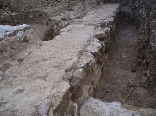 > Entre ces deux murets, l’espace a été utilisé pour installer le radier du conduit, avant de recevoir la forme définitive du specus. Celui-ci, présente à la base un profil trapézoïdal, réalisé avec des pierres calcaires triangulaires, formant le biais de la paroi, qui sont liées avec du mortier blanc et parfois de la terre.