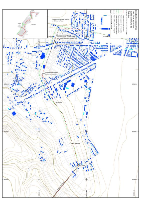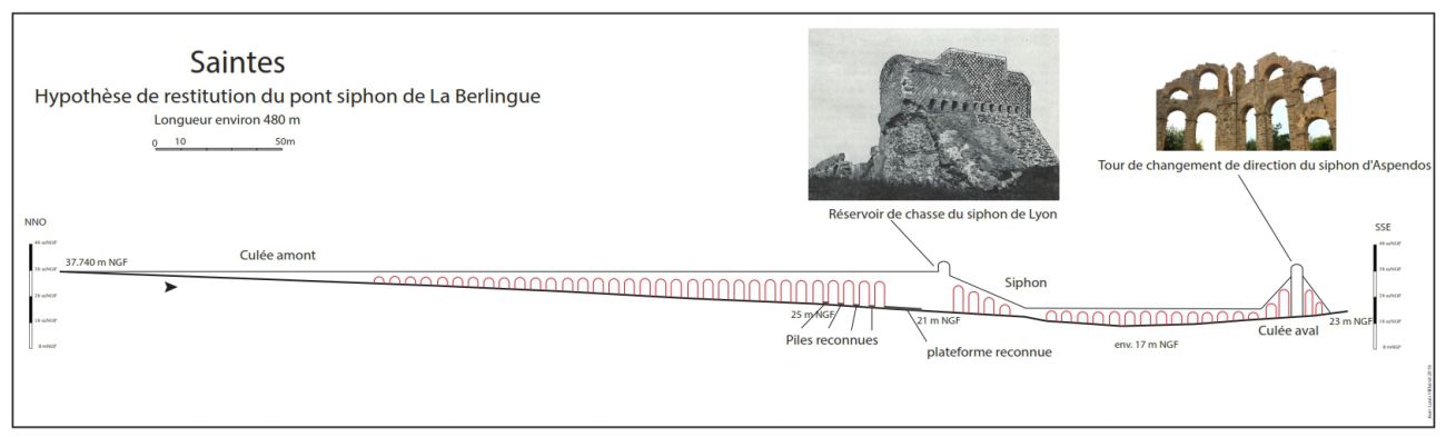 L’emplacement de la première pile mise au jour nous permet d’envisager en amont l’existence d’autres piles. Ainsi, le franchissement total du vallon par ce pont siphon pourrait atteindre les 480 m de longueur. Cependant il est difficile d’attribuer ce pont au premier ou au deuxième aqueduc, voire successivement les deux puis le troisième.