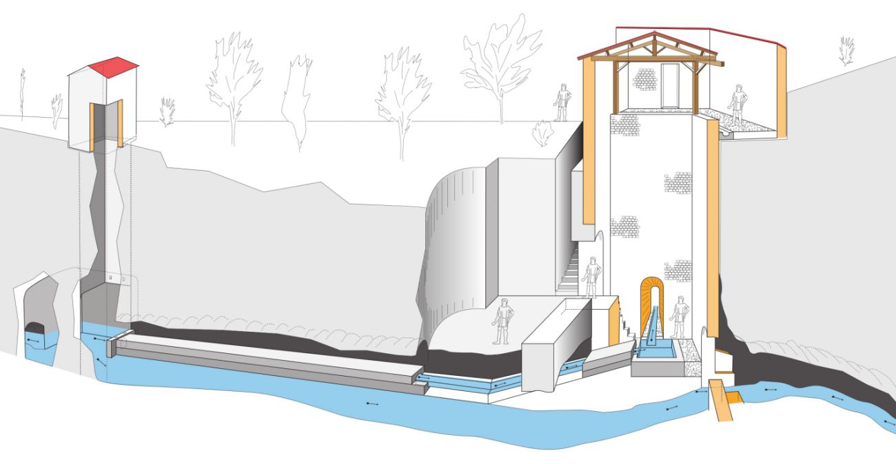 Les Romains ont dû connaître l’existence de cette rivière souterraine, à cause de la présence de la diaclase vers la surface. L’ingénieur romain a réutilisé cet espace pour réaliser ses travaux, comme il l’avait fait à la Grand-Font. Il a utilisé le vide de cette grande salle pour y tailler dans la roche en place jusqu’à la surface, le futur bâtiment antique comprenant entre autres les aménagements suivants : le captage, le bassin, le début du tunnel, le specus et le déversoir.