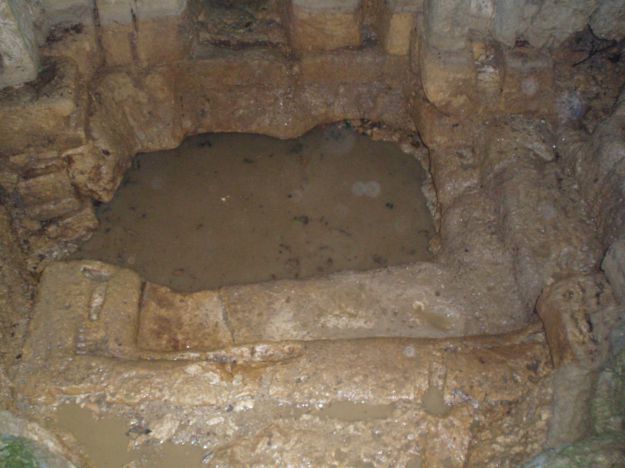 Le bassin de décantation a été réalisé dans un bloc de calcaire monolithe. Il manque au pourtour une élévation de maçonnerie, aussi haute que le conduit afin que l’eau soit conduite vers le specus. Il a été accolé le long du mur inférieur ouest du bâtiment et au début du tunnel.