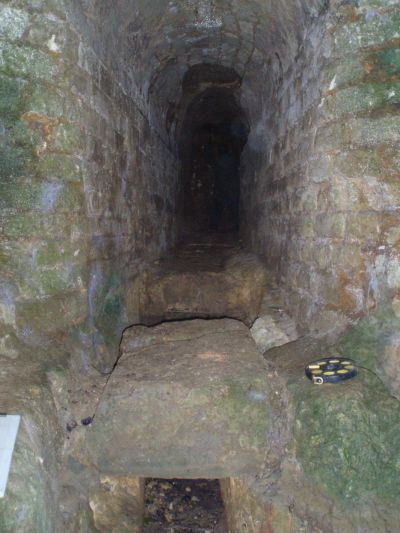 Au centre du mur antique nord-ouest de cette salle, se trouve une ouverture maçonnée dont la clef de voûte est visible depuis l’intérieur de la diaclase et se poursuit sur vingt-six mètres en direction du nord.