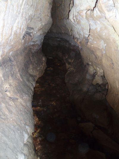 Au centre du mur antique nord-ouest de cette salle, se trouve une ouverture maçonnée dont la clef de voûte est visible depuis l’intérieur de la diaclase. Elle se poursuit sur 26 mètres direction nord. Cette ouverture permet d’avoir accès à la diaclase, car elle est le seul passage possible de l’eau venant du réseau karstique situé en amont.