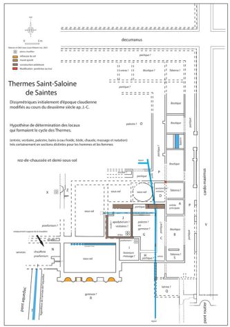 L’hypothèse développée avec beaucoup d’incertitude, montre un ensemble thermal presque complet (restitution ci-dessus). Le reste de l’établissement (en partie en dessous de la rue et du cimetière Saint-Vivien) appartiendrait à d’autres thermes. Ainsi, aurions-nous peut-être des thermes pour hommes et des thermes pour femmes. D’ailleurs un nouvel élément vient étayer cette hypothèse ; la découverte dans le cimetière, à l’occasion d’une reprise de sépulture, d’un large mur avec une abside (en X et Z Fig.1). Il sépare deux pièces, dont une présente un sol et des pilettes d’hypocauste. Ce mur serait peut-être la continuité d’un autre repéré lors des fouilles de 1906, que l’on voit sur le plan de Ballet.