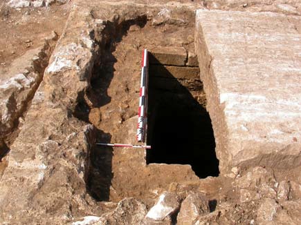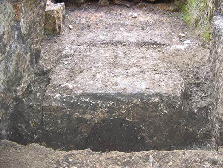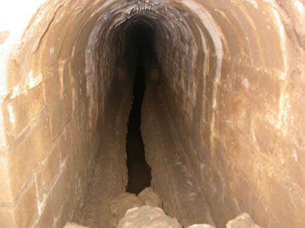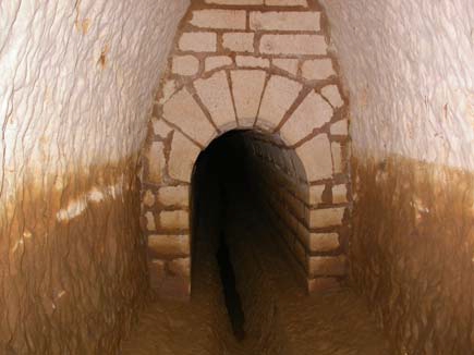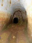 Elle est comblée presque en totalité (Cliché 1 et 2). Le dégagement du comblement supérieur a permis d’explorer une partie de cette galerie jusqu’à la façade d’une maçonnerie située à 24,72 m du début (Cliché 3). Cette maçonnerie a été réalisée à l’intérieur de la galerie. L’extrados sous 50 cm de terre argileuse, présente une forme concave de 3,50 m de largeur (Cliché 4).