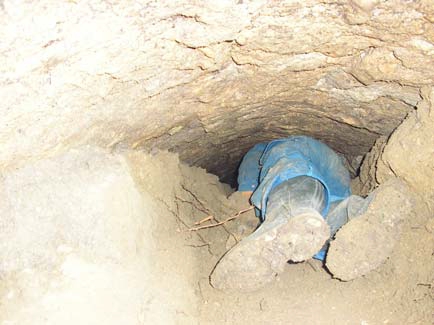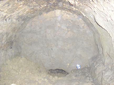 Nous avons ensuite le puits AO 311 n°2 de section rectangulaire (Cliché 8), de taille identique au puits précédent, qui a permis le dégagement de quelques fragments de céramique médiévale datables du XIe siècle, voire du XIIe siècle, à 4 mètres de profondeur. Le fond du specus antique trapézoïdal (Cliché 9) est à 4,64 m de la surface. À cet endroit, la galerie fait une largeur de 1,30 mètre. Après la fouille de ce puits, nous avons eu accès à la section du tunnel (Clichés 10 & 11), comportant de très nombreuses stalactites et d’importantes concrétions calcaires sur les parois. La galerie présente à cet endroit une largeur moyenne de 1,20 m.