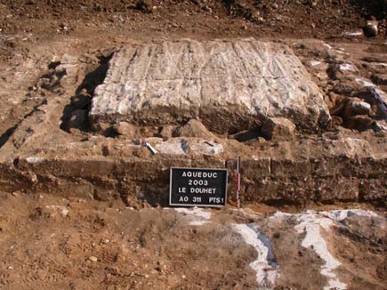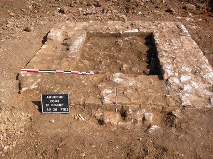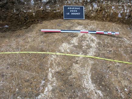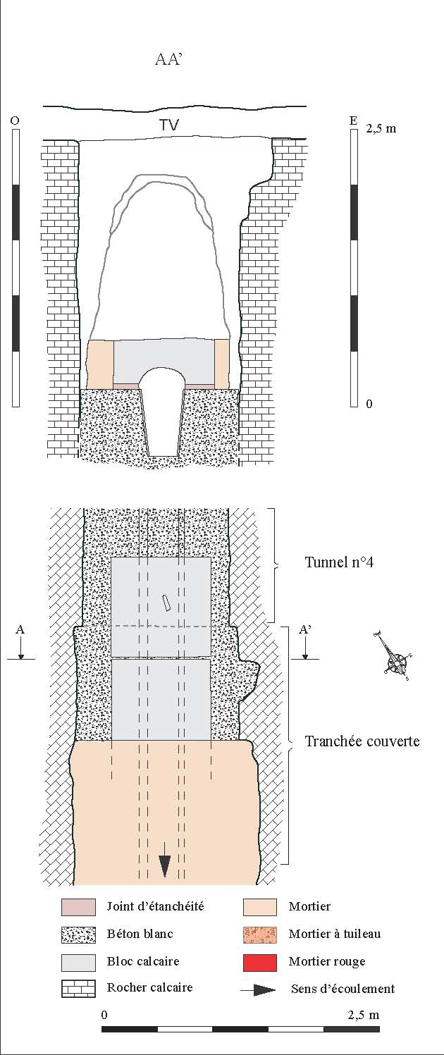En aval, à environ 16 mètres du puits AO 311 n°1, il a été mis au jour la fin du tunnel n°4 (Cliché 14, figure 2). À cet endroit, il n’y avait plus assez d’épaisseur de roche calcaire pour constituer la voûte de la galerie. Aussi, les ingénieurs ont décidé de continuer l’aqueduc en creusant une tranchée.