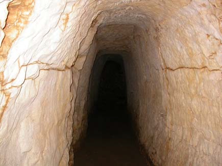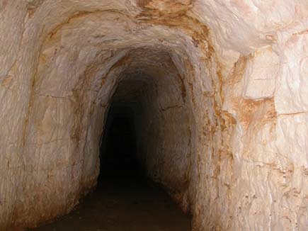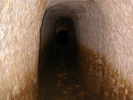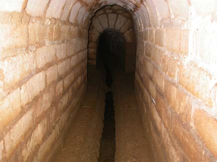 Sur toute la longueur de ce tunnel, nous avons une succession de galeries maçonnées avec de la pierre de taille liée au mortier. Les murs reposent sur les piédroits en béton du specus et la voûte est en plein cintre (Cliché 6). Ces galeries sont maçonnées sur des longueurs variables, de 10 mètres à 39 mètres pour la plus grande (Cliché 7). Elles sont séparées par des sections brutes de taille dont la paroi n’est pas aménagée. Ces maçonneries devaient protéger des déversements d’argile à travers les failles de la roche. La galerie se termine sur un éboulis de pierre provenant d’un puits comblé. Nous remarquons qu’à de nombreux endroits les parois de la galerie ont reçu un mortier colmatant probablement pour se protéger des écoulements d’argile.